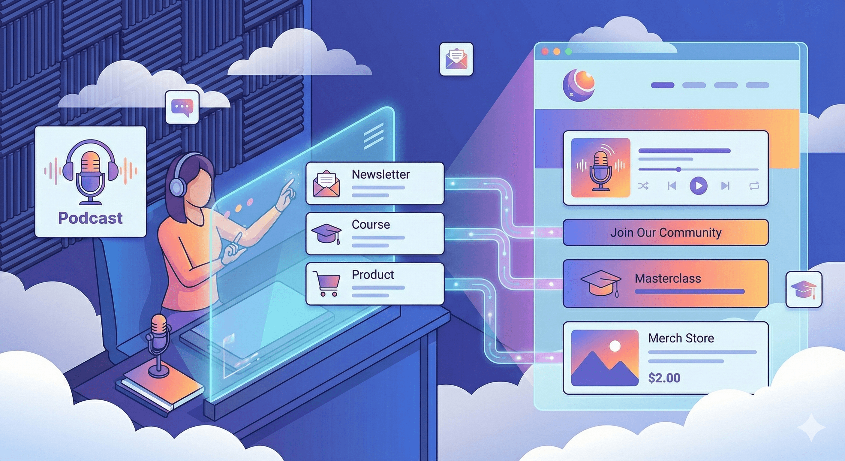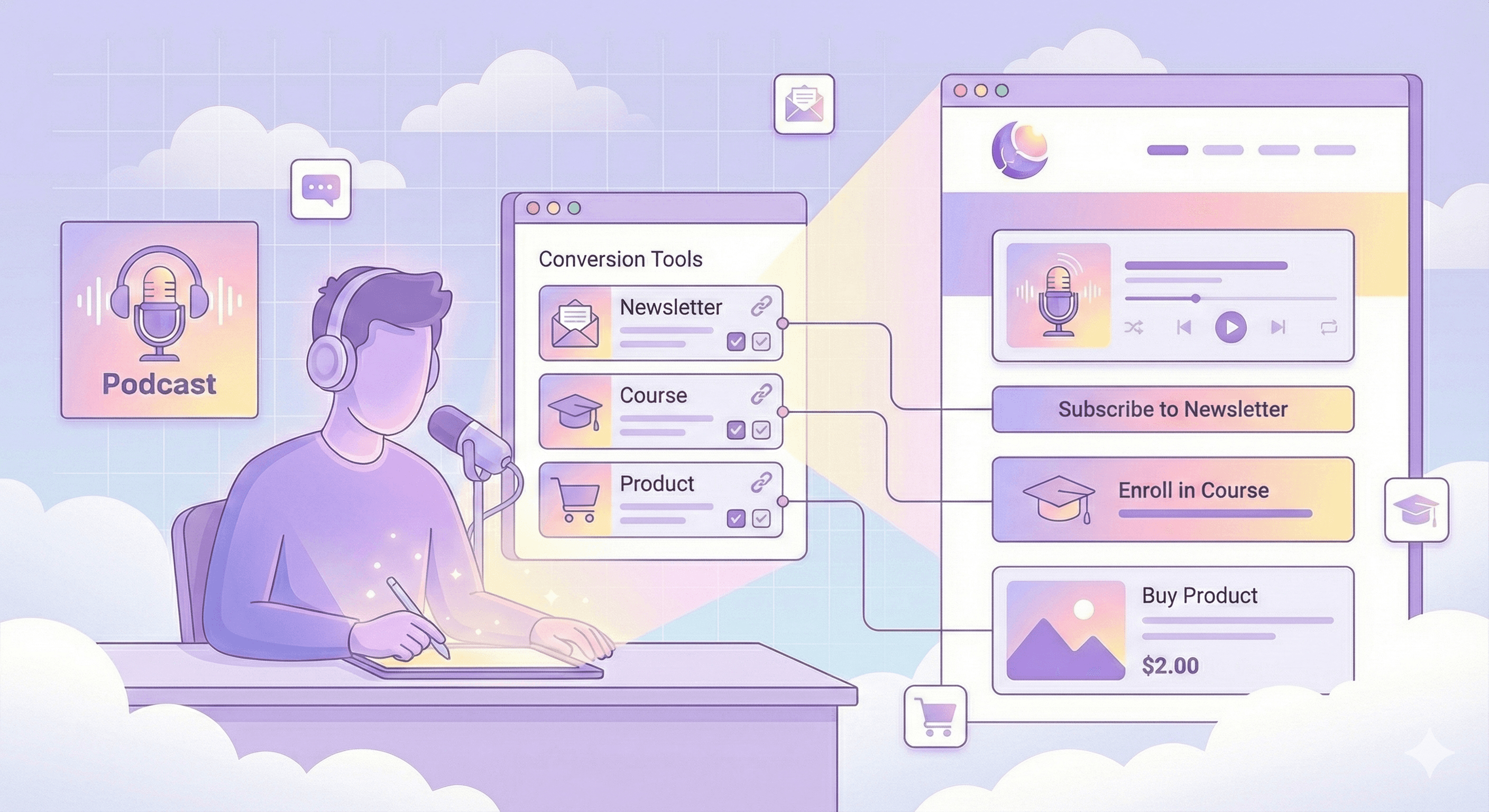 Pair episodes with newsletters, courses, or products on the same page. From Podcast to real transactions in one site